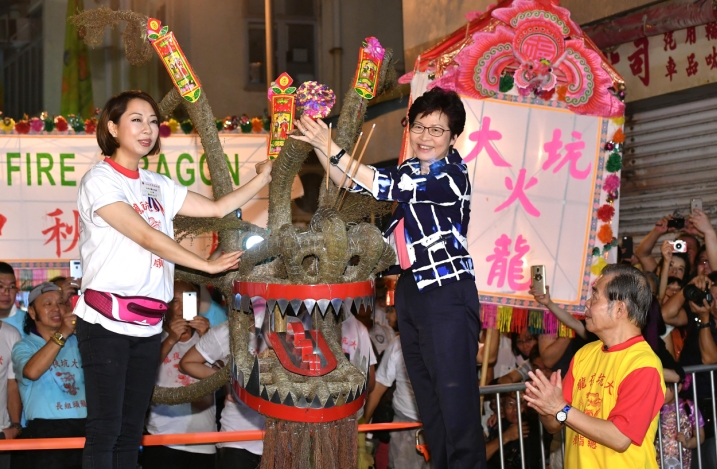 【香港商報网訊】中秋佳節,人月兩圓。行政長官林鄭月娥昨晚出席2017年中秋大坑舞火龍盛會,為火龍主持簪花挂紅儀式,并與眾多嘉賓和市民一同感受中秋佳節的熱鬧氣氛。她致辭赞賞大坑坊眾福利會多年來的努力和堅持,令盛會延續近140年歷史、更位列國家級非物質文化遺產之一。儀式后,火龍更舞入銅鑼灣維園,與民共舞。