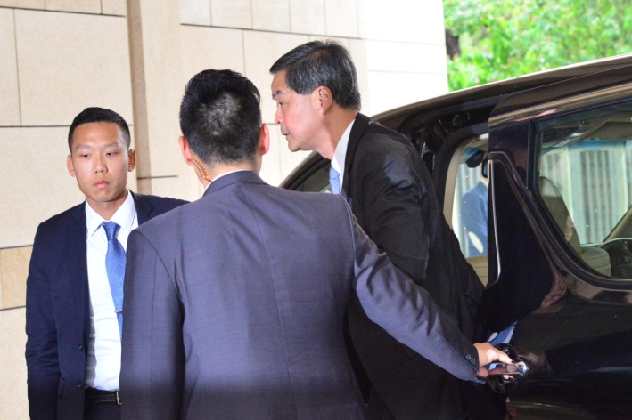 前特首梁振英(右)昨在要员保护组人员护送下步入法庭。
