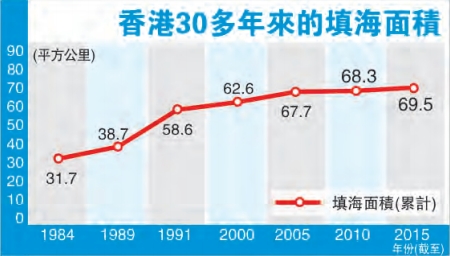 據地政總署資料顯示,截至1984年,香港累計填海面積為31.7平方公里;到1995年逾十年時間內,填海面積足足又增加了近27平方公里,至58.6平方公里。而由2000年開始,香港填海土地則以緩慢速度增長,當年累計填海面積為62.6平方公里;再到2010年的十年間,全港填海面積只增加了不到6平方公里,至68.3平方公里;兩年前的2015年,最新數字亦只有69.5平方公里。