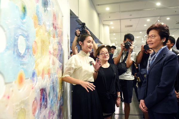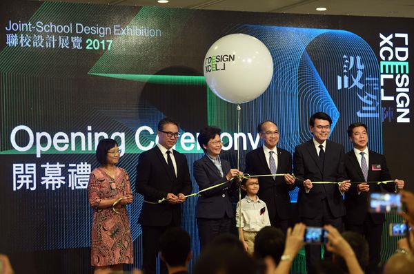林鄭月娥(左三)、工總主席郭振華(右三)及副主席嚴志明(左二)等,主持聯校設計展覽開幕禮。中通社