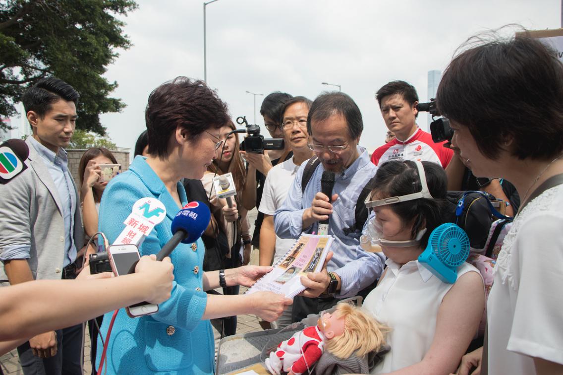 林鄭月娥解釋,藥廠未將新藥引入香港,醫管局現時難以提供藥物援助,絕對不是資源或金錢問題,她已親自要求食物及衛生局與美國藥廠商量可否引進這種藥,但到今日為止,接收的資料,都是沒打算將這藥引入來香港。在目前醫療制度下,如藥物是沒註冊沒登記,醫管局亦難以提供援助,不過政府不會放弃,會繼續爭取,她逗留5分鐘,接過計劃書及請願信后離開。