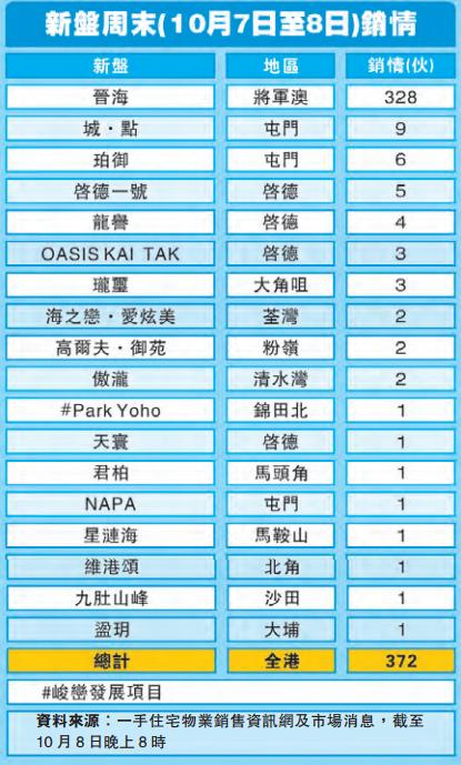 【香港商報网訊】記者葉子睿報道:新鴻基地產(016)旗下「晉海」繼續領跑周末新盤銷情,於上個周六、日售出共328個單位,綜合一手銷售網及市場消息,截至昨晚約8時左右,全港一手市場共賣出約372伙。由於上星期「晉海」銷售量比前一周下降,直接導致周末新盤成交量有所下降,較前一周的441伙成交量下跌69伙。而新地「晉海」銷售理想,發展商加推208伙,及公布於星期四(12日)銷售10伙800平方尺以上大單位。