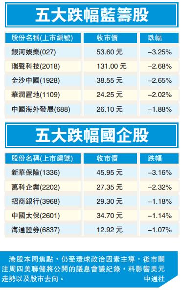 10月份股市開門紅,挾升大市氣氛,惟環球政局不明朗,港股於北水重開當天反高潮回軟。港股通(滬)及港股通(深)共錄得21億資金净流入,惟港股重磅藍籌窄幅上落,股王騰訊(700)跌0.8%,拖低恒指26點;中移動(941)跌0.7%;友邦保險(1299)跌0.2%;豐控股(005)靠穩,升0.2%。上周炒明年定向降準的內銀股回吐,四大行跌幅介乎0.5%至0.9%。新股王眾安在帹(6060)早段冲上97.8元新高位后有獲利回吐,收市倒跌3%報90.8元。