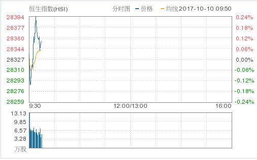 隔晚美股三大指數向下,惟跌幅輕微。即將迎來的季度業績期受到關注,資料顯示,標普500成份股企業第三季盈利將增長4.8%,低于今年前兩季錄得的兩位數增幅。恒生指數今早高開0.03%,報28334.92點;國企指數低開0.01%,報11384.58點;紅籌指數高開0.02%,報4374.92點。大市成交額12.61億。