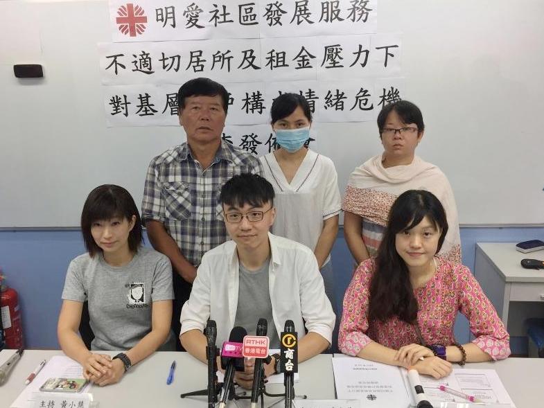 明愛社區發展服務於本年5月至8月,訪問逾400名租住寮屋、村屋及私人樓宇的基層人士,其家庭入息中位數為1.1萬元,發現居住在九龍區和新界及離島區的受訪者,租金佔入息比例分別達34.5%及28.8%,比去年分別上升2.2%及1.3%;港島區的受訪住戶租收比雖比去年下降1.6%,但卻達44.4%,為3個地區中最高。而有關人士,較多出現焦慮情緒,其中45.5%受訪者有抑鬱症傾向,及44.1%有焦慮症傾向。