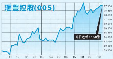 昨天大市由升轉跌,但匯豐控股(005)卻保持升勢。事實上,匯控於近期的升幅并非很大,相對而言,跌的壓力亦較小;加上集團持續回購,昨天公布,上周五(10月6日)以每股7.523英鎊至7.583英鎊,回購139.61萬股,按每股加權平均價7.555英鎊計算,涉資1054.7萬英鎊(約1.08億港元)。於波動市中,匯控可作為穩健之選。