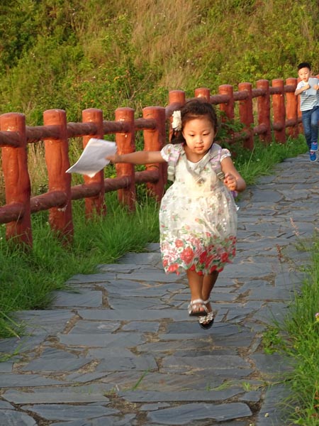 虎山輕鬆易行,有小朋友在路上奔跑比賽。