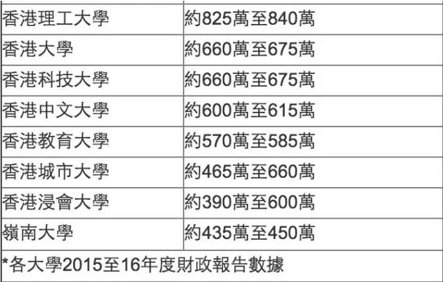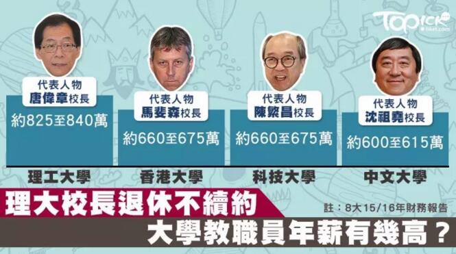 理大校長年薪最高,824-840萬港幣,算下來最少也有69萬月薪;