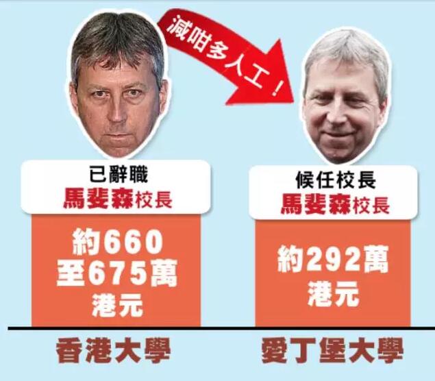 還有港大校長馬斐森辭職後跳槽去的愛丁堡大學,愛丁堡現任校長年薪約290萬港元,而馬斐森的年薪逾600萬港元,這一跳活活減薪了一半!