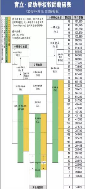 中學校長起薪84,385港幣,到一級校長月薪121,985港幣,要是老師職稱高,能達到首席學位,工資分分鍾跟校長打平手!