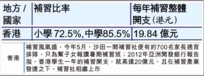 據亞洲發展銀行統計顯示,香港超8成學生在參加補習(香港小學有72.5%學生補習,中學有85.5%學生補習),每年花銷超過20億港幣。