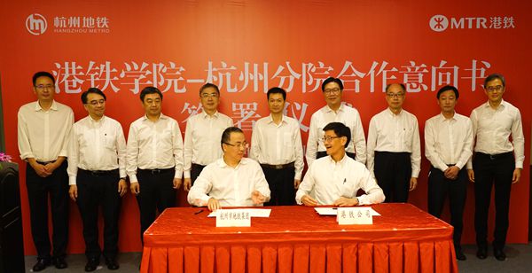 【香港商報网訊】港鐵公司昨日與杭州市地鐵集團簽署意向協議書(上圖),計劃成立「港鐵學院杭州分院」,立足杭州,配合「一帶一路」的發展策略,在中國內地及「一帶一路」沿線培育鐵路專才。