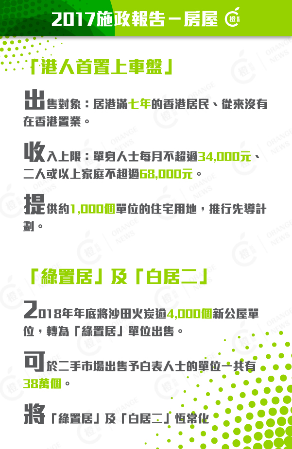 新一份「施政報告」提出一系列新土地房屋方案,包括「港人首置上車盤」、「綠置居」與「白居二」恆常化,及各類過渡房屋,锐意為有意置業惟無力購買私樓人士提供上車梯級。
