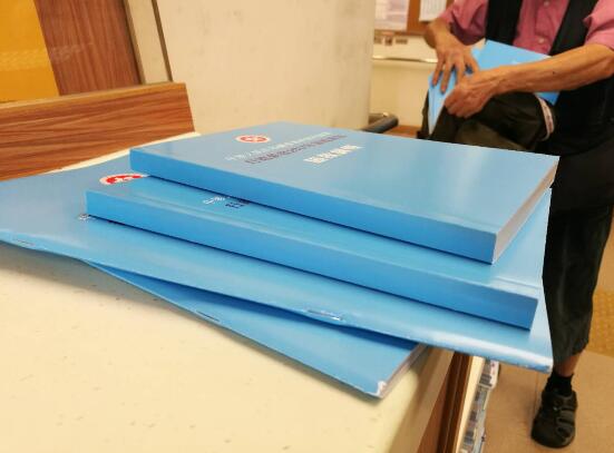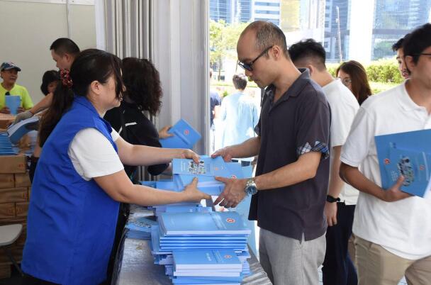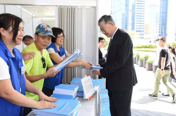 市民到政府總部外拿取施政報告。(林骏强摄)
