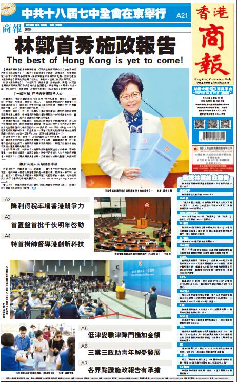 【香港商報网訊】記者林駿強報道:行政長官林鄭月娥昨於立法會發表任內首份《施政報告》。《報告》涵蓋發展多元經濟、改善民生、打造宜居城市及青年政策等多個領域,務求為香港未來帶來新起點。她形容這份《施政報告》展現的風格為「有決心、敢創新,并努力做到無微不至」。
