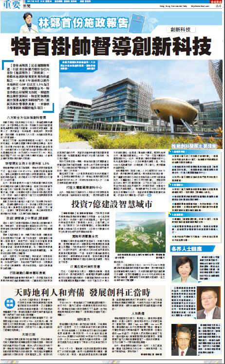 香港總商會主席吳天海:欣悉特首將親自領導一個高層次的「創新及科技督導委員會」,為推進創科發展提供急需的動力。香港作為領先的國際商業和金融樞紐,我們早已不時提醒政府,本港在這個領域的進展何其緩慢。