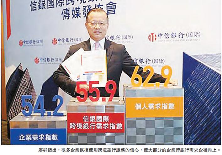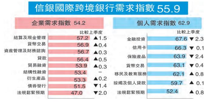 中信銀行(國際)首席經濟師兼研究部總經理廖群表示,9項企業跨境銀行需求子指數中,6項較上季度上升。結算及現金管理子指數上升最快,升幅達1.5,至57.2;貨幣交易、資產管理及財務諮詢、貸款、貿易融資與衍生產品子指數溫和上升,分別達56.9、56.7、56.4、53.9與53.3;結構性融資子指數維持不變於53.4;債券發行子指數大幅降至51.5。