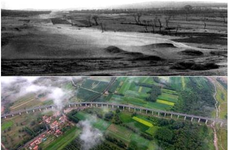 拼版照片:上图为治理前的山西省右玉县右卫镇的景象(资料照片);下图为现在山西省右玉县右卫镇一带的景象(图片来源:新华社)。