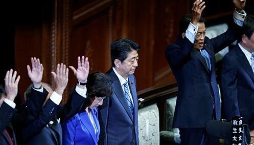 当地时间2017年9月28日,日本首相安倍晋三宣布解散众议院后,多名内阁成员举手欢呼。