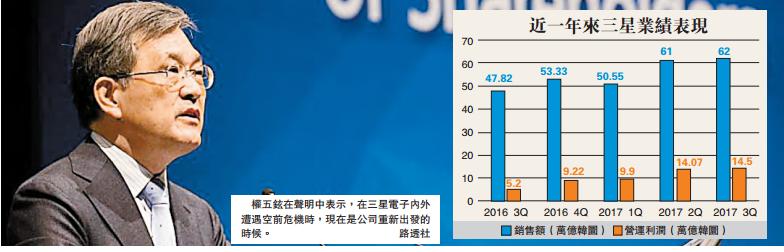 【香港商報网訊】三星電子昨日再度發生動蕩,該公司副會長兼CEO權五鉉宣布將辭職。當天稍早,三星電子公告預期今年第三季營業利潤同比增長178.9%,達14.5萬億韓圜(約合1000億港元),有望再創歷史新高。然而,靚麗的季度營利未能阻擋權五鉉離開三星電子的腳步。權五鉉說,三星電子正面臨「空前危機」。