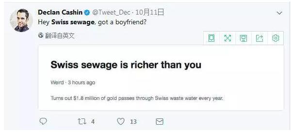 此消息一经报道,立刻在国外的社交媒体上炸开了锅。有网友在推特上一篇名为《瑞士的下水道都比你富有》的文章下调侃道:“Hi,瑞士的污水管道,你还需要男朋友吗”