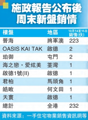 【香港商報网訊】記者曾浩榮報道:特首林鄭月娥上周公布首份施政報告,之后本港樓市未見震蕩,特別是一手市場。惟台風昨日襲港下,交投才稍見停擺。在剛過去的周末(14日至15日),全港新盤仍賣出約232伙。其中,單計新地(016)將軍澳「晉海」單日就沽出223伙,發展商更「乘勝追擊」推出「晉海II」首張價單以鎖定購買力。