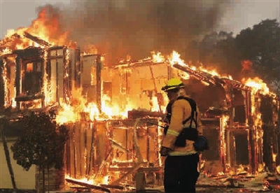 当地时间2017年10月14日,美国加州,加州消防员正在紧急救火。据媒体报道,美国加州北部林火持续延烧,目前已造成至少40人死亡,10万居民撤离,这场山火也成为加州史上最致命的野火。风向不断改变,助长猛烈野火扩大延烧,14日又有数千人被迫撤离家园,由于仍有数百人失联,罹难人数势必还会攀升。报道称,16处大型野火过去7天已焚毁将近86000公顷住宅区和林地等,比纽约市面积还要大。目前已确认至少40人罹难,也使得这场野火成为加州史上最致命森林野火。约10万人已被迫撤离家园,包括旧金山以北约80公里的圣罗沙市(Santa Rosa)14日又有3000人撤离,以及邻近索诺马市(Sonoma)又有250人撤离。
