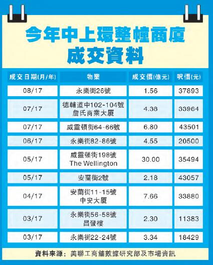 【香港商報網訊】記者葉子睿報道:除了傳出長實以402億出售中環中心外,根據美聯工商舖資料,今年已錄得16宗整幢商廈成交,其中位於中上環的整幢商廈最受歡迎,有8宗成交,占比五成。而最近一宗中上環整幢商廈,是位於上環永樂街26號的全幢物業,由大鴻輝管理公司以1.56億元購入,該物業為樓齡51年的6層高商廈,料將合併比鄰集團旗下地盤重建。
