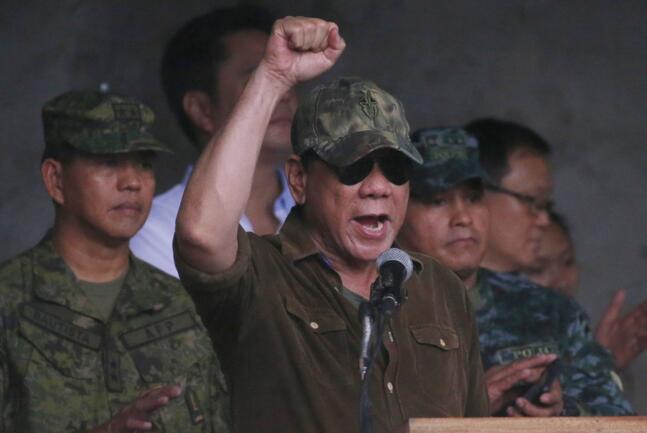 当地时间2017年10月17日,菲律宾马拉维市,菲律宾总统杜特尔特对士兵发表讲话。杜特尔特正式宣布马拉维已经从恐怖分子手中解放,军方将继续打击残余恐怖分子。