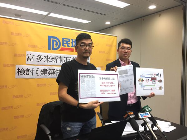 民建聯立法會議員劉國勋(右)就大角咀富多來新邨工程費用失踪事件召開記者會。記者馮煒強攝