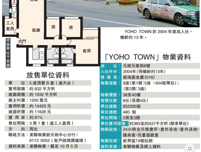 美聯物業新元朗中心分行客戶經理譚健璋表示,「YOHO TOWN」的連天台特色戶非常罕有,全屋苑只有2個放盤,當中包括今期介紹單位。譚續指,新盤「GRAND YOHO」標準3房單位售價約1000萬元,今期介紹的頂層連天台單位售價約1200萬元,可以算是較優質的樓盤。