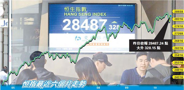 【香港商報网訊】記者吳天淇報道:港股本周再創近十年高位,經過日前大震倉之后,昨天在內銀及內房股帶動之下,反彈超過300點。恒指收市報28487點,升328點或1.17%,成交967億元,全周計累漲11點,為3周連升。國企指數收報11558點,升200點或1.77%,全周則累升38點。