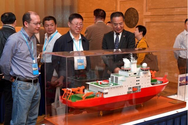国家海洋局科学技术司司长曲探宙(中)与上海市船舶与海洋工程学会理事长、中国船舶工业集团公司第七〇八研究所所长邢文华(右)在船模前