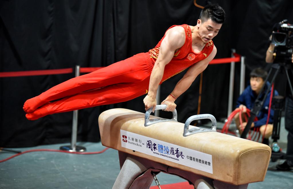 中國香港體操總會主辦的「國家體操匯香港」表演,昨晚在灣仔伊利沙伯體育館舉行,左圖:國家隊成員尚蓉施展舞彩帶絕技,讓觀眾大開眼界;下圖:林超攀表演鞍馬,贏熱烈掌聲。