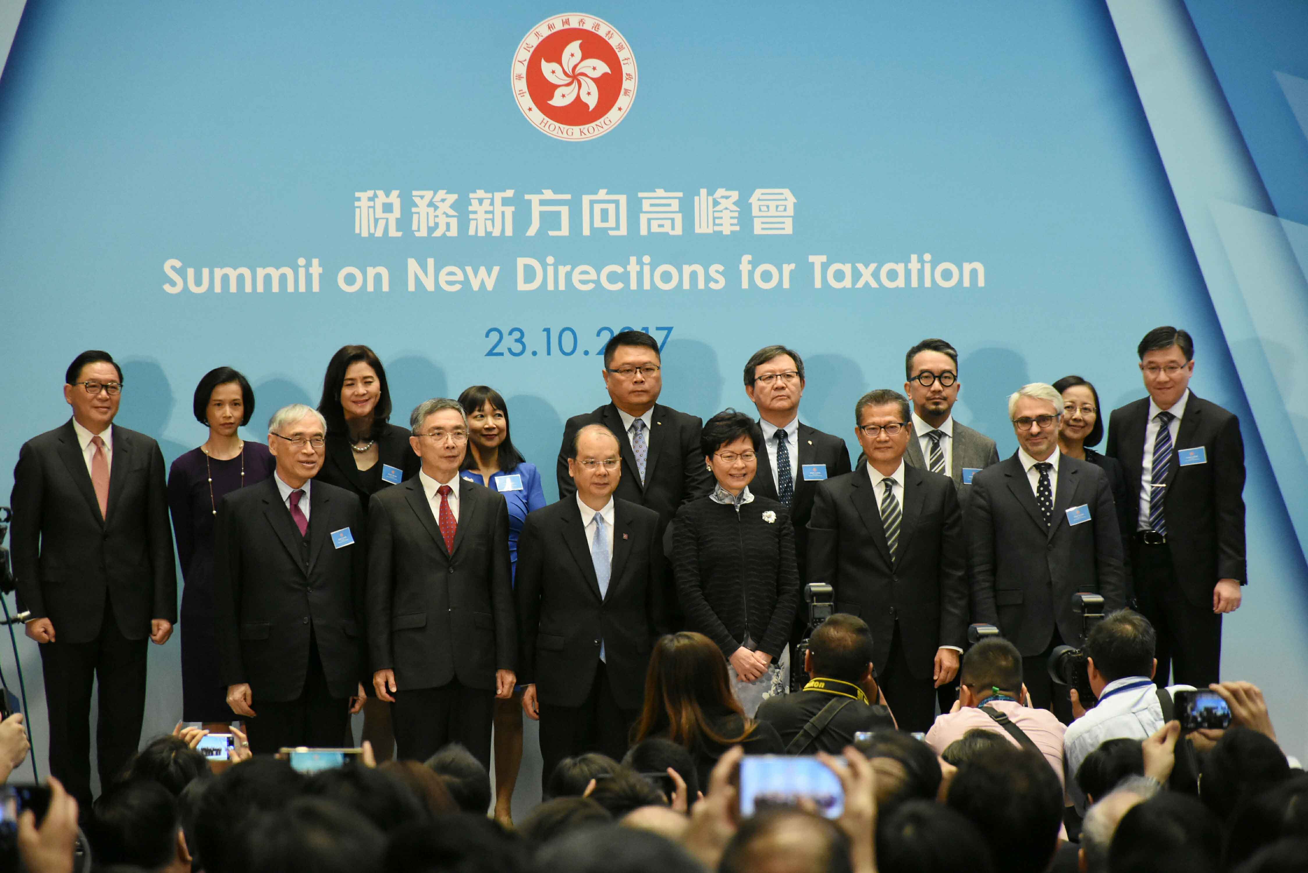 稅務新方向高峰會昨於政府總部舉行,行政長官林鄭月娥(前排右三)與官員及出席嘉賓合照。 記者 馮瀚文攝