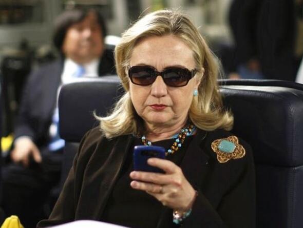 2011年10月18日,美国国务卿希拉里在飞往利比亚首都的黎波里的军用运输机上查看着“黑莓”手机。(图片来源:新华/美联)