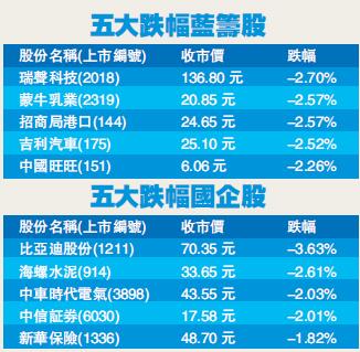 重磅股偏軟拖低大市,友邦保險(1299)連跌4日,收跌0.7%;騰訊(700)跌0.3%。內房股逆市造好,融創中國(1918)創41.8元新高,收市漲近4%;碧桂園(2007)勁升6.7%;傳萬科(2202)有機會收購深圳地鐵前海國際,收升3.8%,是表現最佳國指成分股。