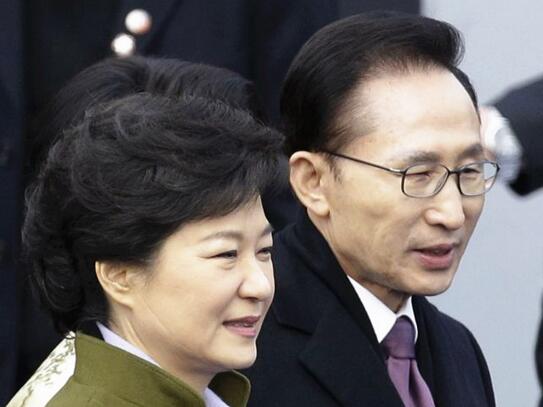 2013年2月25日,韩国新总统朴槿惠(左)与卸任总统李明博在就职仪式后交谈。(新华/美联)