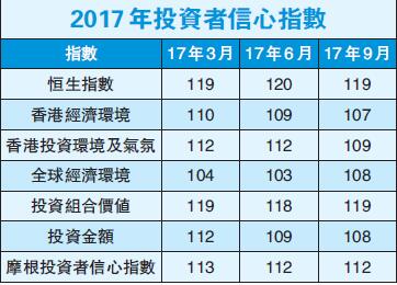 至於「全球經濟環境」的信心飆升5點至108點;投資者對個人資產升值的信心亦有所增加,反映於「投資組合價值」分類指數增加1點至119點。