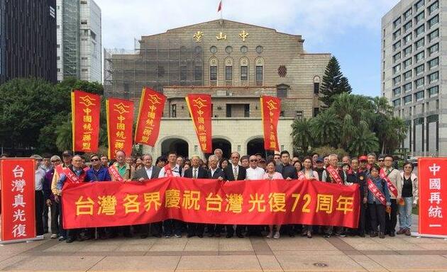 当天上午,由中国统一联盟主办的台湾各界庆祝台湾光复72周年活动,依旧在台北中山堂“抗日战争胜利暨台湾光复纪念碑”前举行。台湾各界代表近百人在这里缅怀抗日先烈,庆祝台湾光复72周年。各界人士合唱光复纪念歌曲,向纪念碑行三鞠躬礼,并向先烈献花,表达追思与敬意。