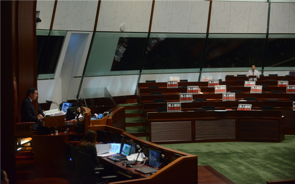 昨天立法会大会期间,反对派议员利用各种手段疯狂“拉布”,他们绝大部分长时间不在场,只留下一堆反对标语。记者 崔俊良 摄
