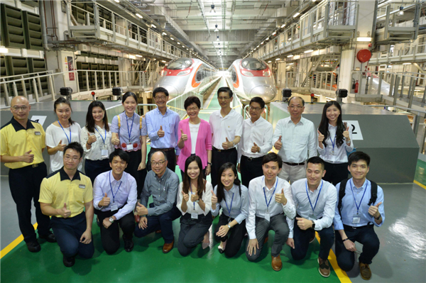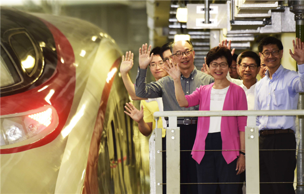今年7月,林郑月娥履新特首后不久就率管治团队赴西九参观新到港高铁列车(二排左为运房局局长陈帆)。资料图片