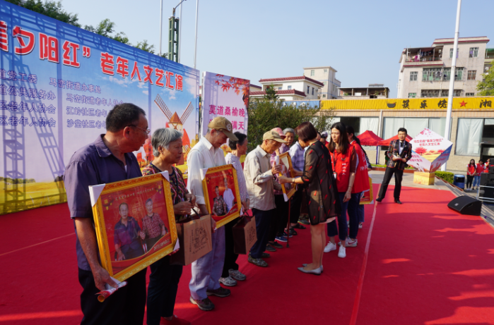 【香港商报网讯】记者焦家志 通讯员吴玲敏、彭远维报道: 10月26日下午,江岭社区文化广场歌声飞扬,坪山区马峦街道正在这里举办“最美夕阳红”老年人文艺汇演,来自辖区的200多位老人观看了演出。演出伊始,马峦街道党工委委员、办事处副主任黄雪英为辖区5对金婚夫妻代表发放了为他们专门拍摄的夫妻照和祝福礼品。
