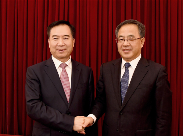 胡春华(右)和李希在广东全省领导干部会议上握手。中新社