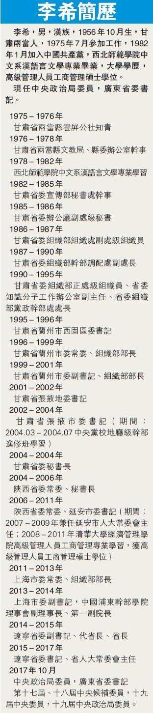 李希是第十七屆、十八屆中央候補委員,在十九大上當選為中央委員,並與他的前任胡春華一樣,在中共十九屆一中全會上當選為中央政治局委員。