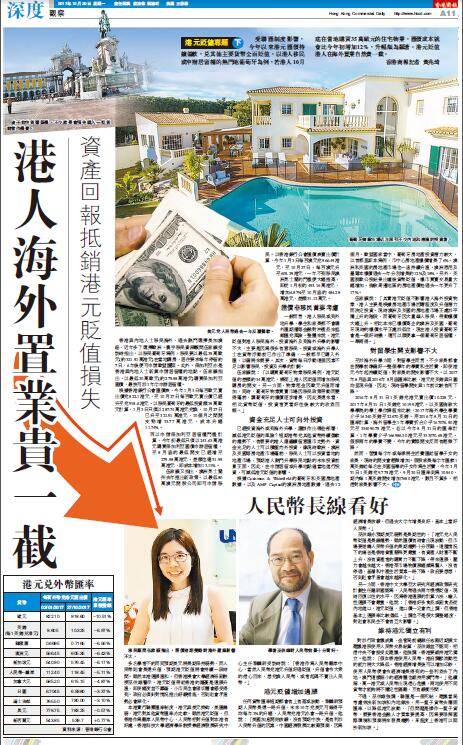 伍家颖說:「其實港元貶值不影響港人海外投資物業,港人主要是根據房地產市場活躍程度及升值潛力而決定投資。現時澳洲及英國的房地產市場正處於平穩上升的階段,而葡萄牙因大量華人移民,帶動樓價大幅上升。相比本來已樓價高企的澳洲及英國,葡萄牙現時的樓價水平正處於低位,現在港人投資葡萄牙會是一個好時機,還可以順便拿一個葡萄牙居留權,一舉兩得。」