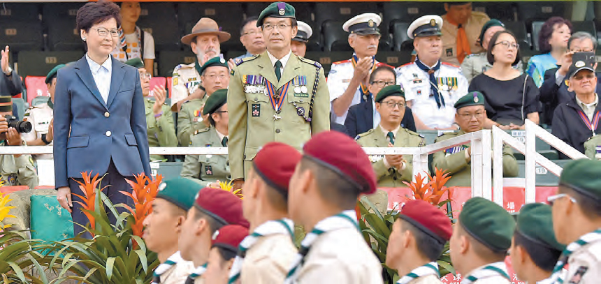 【香港商報網訊】記者周偉立報道:行政長官林鄭月娥(圖左)昨日首次以首位女童軍總領袖身份,在香港大球場參與一年一度的童軍大會操。她致辭時鼓勵各童軍成員不單要「日行一善」,亦要多關心社會,積極參與社區事務,發揮所長,一同為香港建立更美好的將來。