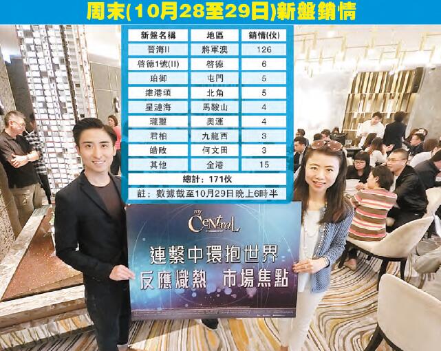 【香港商報網訊】記者潘晶報道:周末(28日及29日)一手樓市有所回落,綜合物業銷售網及市場消息,截至昨晚6時半,本港新盤周末約賣出171伙,較上周的257伙跌逾三成,惟新地(016)將軍澳新盤「晉海II」仍反應良好。香港置業行政總裁李志成表示,自《施政報告》公布后,樓市愈趨明朗化,發展商連環推盤,新盤市場持續火熱,當中將軍澳新盤本周日加推銷售,成績理想,反映買家入市意欲積極,購買力向新盤傾斜。