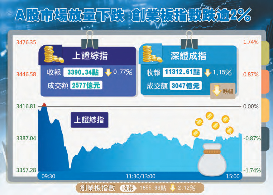 【香港商報網訊】記者王長久報道:維穩行情上周落幕,本周內地股市就做出方向性選擇,10月30日兩市場均見黑色星期一,上證綜指有兩桶油、保險、銀行等大藍籌保駕護航跌幅最終收斂到0.77%,而缺乏主力護盤的深成指大跌1.15%,中小盤科技股集中的深圳創業板指數則暴跌2.12%。市場出現一定的恐慌情緒,成交額比上周五放大了1000個億。