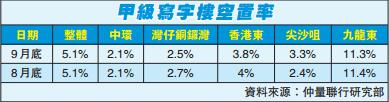 K11 Atelier本月已取入伙紙,連同該廈預租的樓面,以及持續錄得的遷離核心區租務成交,令9月整體市場錄得295000平方呎。其中一個遷離核心區的個案為Covestro承租港島東中心約20300平方呎樓面;IMG則承租多盛大廈13000平方呎樓面,兩家公司均由灣仔及銅鑼灣區遷入。
